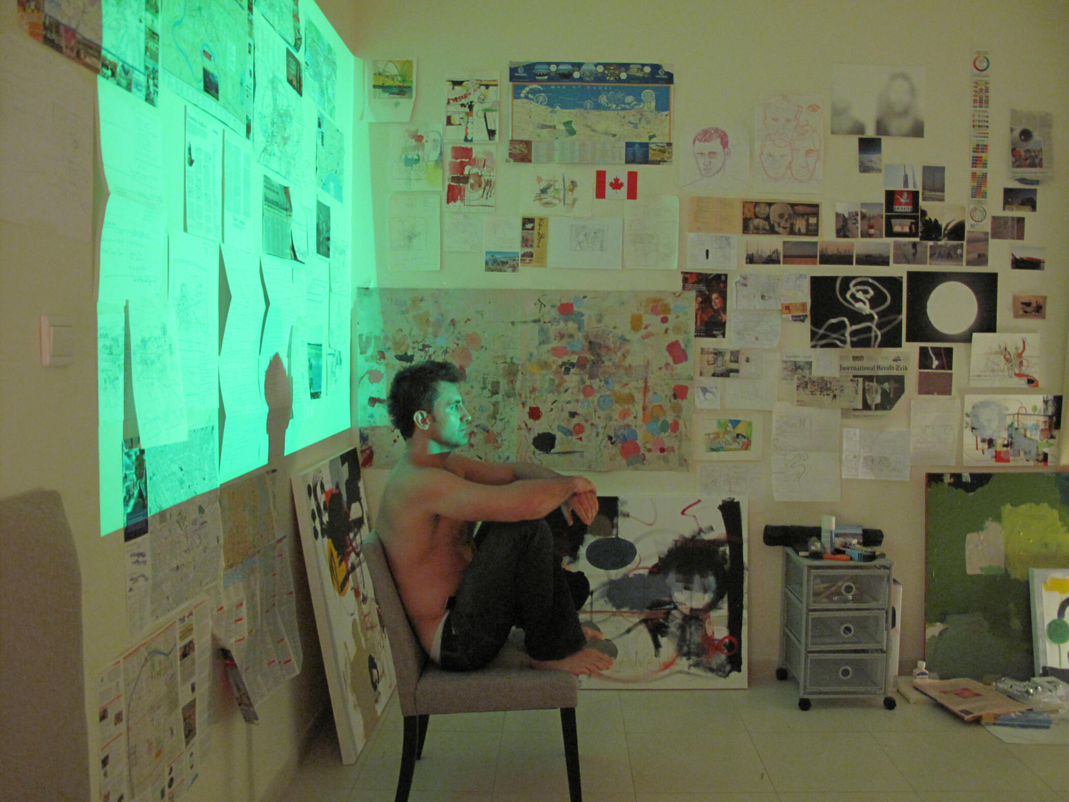 Framed by Praxis - Studio installation and self-portrait in process.The piece documents the studio as an active site of research, where images, diagrams, and handwritten fragments form a working ecology of ideas. Sitting inside this environment, the artist becomes part of the analytical field — framed by the very materials that shape his practice. The work examines how thinking, making, and collecting intertwine in contemporary creative process.2013