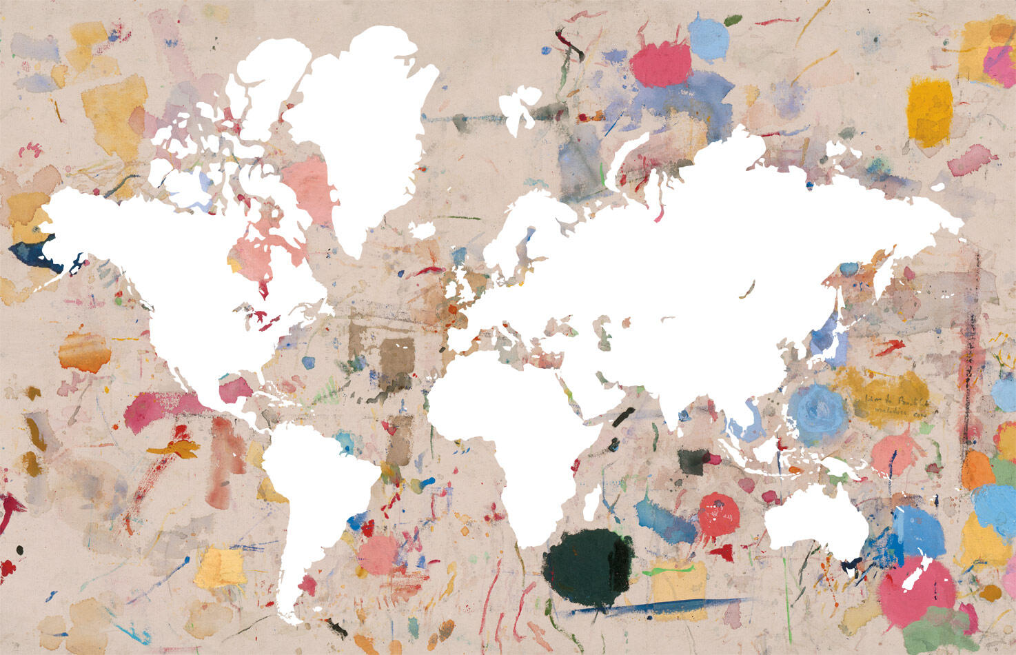 The World — An Object for Aesthetic Contemplation: Digital print / mixed-media compositionThis work overlays the silhouette of the world map onto a painter’s drop cloth—an unplanned record of drips, gestures, and accumulated studio residue. By merging cartography with accident, the piece transforms a functional surface into a field of global abstraction.The World — An Object for Aesthetic Contemplation invites viewers to read geography through the language of chance: borders dissolve, continents float inside colour and texture, and the map becomes an image freed from politics and utility. What remains is a meditation on how we see the world when stripped of narrative—simply as pattern, rhythm, and form.2013